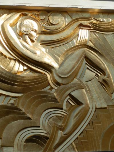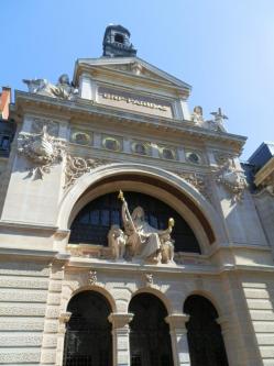sur le fronton triangulaire. Des éléments décoratifs en veux tu en voilà surgissent de part et d'autre de l'ensemble qui reste néanmoins équilibré même si tout ne semble pas cohérent...la jolie couleur pâle de la pierre vient adoucir la statuaire principale un peu trop lourde représentée par les traits du dieu du Commerce, Mercure, que l'on reconnait facilement à sa couronne de laurier, le coq trenu dans la main droite, et le caducée dans la main gauche. Le regard atone et vague propre à la statuaire figée dans l’éternité...... Les élégants "fluctuat" qui surgissent en haut des façades viennent rappeller